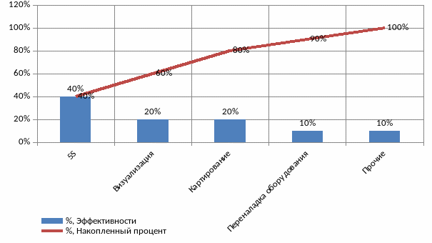 | Методы бережливого производства | % Эффективность метода устранения потерь в дистанции | % накопления |