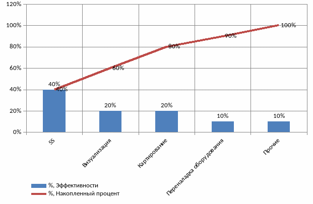 По данным диаграммы Парето получили, что для устранения большей части потерь необходимо внедрить в дистанции такие методы бережливого производства как система организации 5S, визуализация рабочего процесса, картирование.