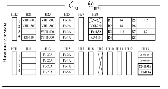 Подключение производится от измерительной панели через предохранители 0,3А, схема расположения предохранителей на полках РШ показана на рисунке 2.3. На один КДСТ-ФД подключается один объект контроля, таким образом на одну СТ требуется два КДСТ-ФД для измерений и контроля напряжений ООХ, ОПХ, РПХ, РОХ.