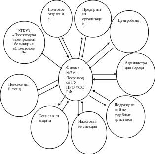 Филиал № 7 г. Лесозаводск ГУ ПРО ФСС РФ активно взаимодействует с внешней средой, без этого взаимодействия невозможна деятельность исследуемой организации. Важное значение для Филиала имеет обратная связь. Филиал постоянно получает информацию из внешней среды, связь со внешней средой показана на рисунке 16.