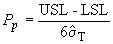 - индекс пригодности процесса без учета настроенности процесса на центр поля допуска, применяется при отсутствии стабильности у процесса. Типовое выражение: