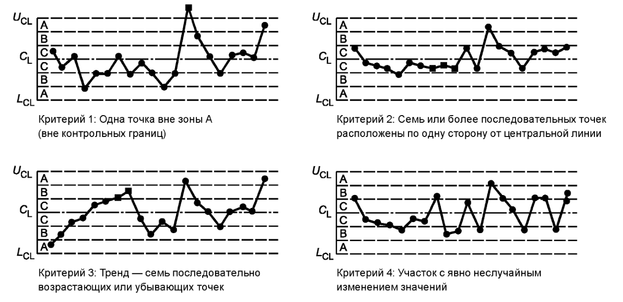 Процесс, у которого последовательность точек на карте соответствует одному или более критериям, является неуправляемым, и особые причины его изменчивости должны быть выявлены и устранены. Эти дополнительные правила улучшают способность контрольной карты обнаруживать небольшие изменения среднего процесса за счет увеличения количества ложных сигналов. Если на