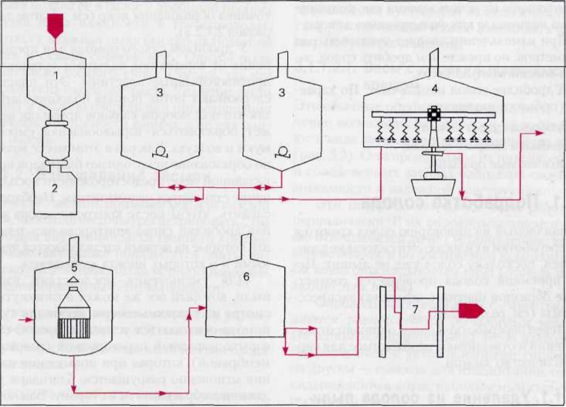 На рисунке 12 изображены последовательные стадии процесса приготовления сусла: 1-Бункер для солода; 2-дробилка для грубого помола; 3- аппарат для затирания; 4- фильтрационный чан; 5- сусловарочный котел; 6- вирпул; 7- пластинчатый холодильник.