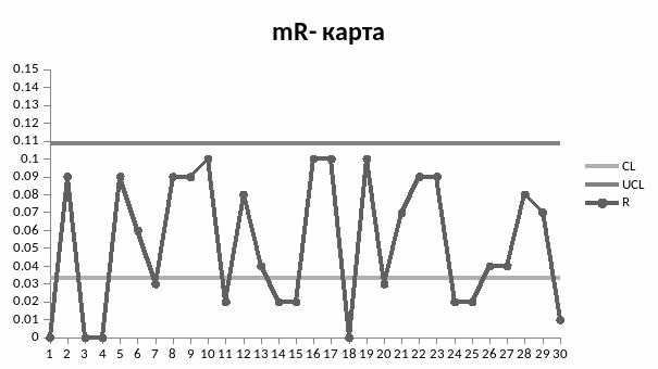 В таблице 21 представлены результаты лабораторного анализа уровня pH холодного сусла ОКОМЕ 15%, проведенного по выборкам из 30 последовательных партий на заводе, а так же посчитан сразу скользящий размах значений pH.