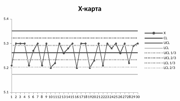 - центральная линия CL = 5,2625 (это среднеарифметическое значений Х, таблица 3);