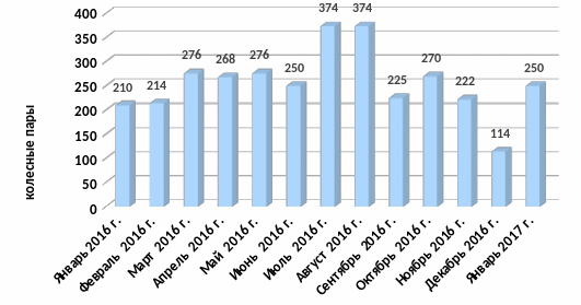 За прошедший год в колесно-роликовом участке был произведен средний ремонт 3323 колесных пар. Помесячное распределение колесных пар поступивших на средний ремонт в участок за 2016 год представлено рисунке 1.2. Отношение между максимумом и минимумом ремонта колесных пар составляет порядка 260 колесных пар, поэтому наблюдается высокий уровень неравномерной подачи колесных пар на ремонт, что отражается на работе участка.