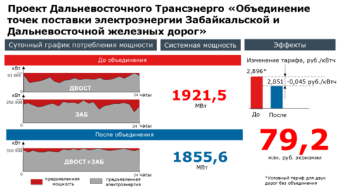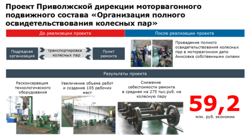 В 2016 году среди наиболее эффективных проектов проект в ТЧМ Анисовка Приволжской дороги с эффектом 59 млн. рублей за счет концентрации ремонтов, представленный на рисунке 2.2 и проект Дальневосточной дороги с эффектом 79 млн. руб. за счет объединения точек поставки электроэнергии представленный на рисунке 2.3. Мотивация за эти проекты исчисляется миллионами рублей. Безусловно, есть аналогичные проекты и в Дирекции тяги, и в Дирекции инфраструктуры, и в других дирекциях. Данные проекты демонстрирует серьезный потенциал бережливого производства в повышении эффективности деятельности.