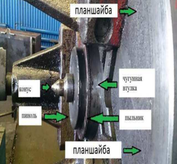 | В процессе эксплуатации колесотокарного станка ТК912ФЗ выявлен люфт пиноли, что негативно влияло на качество обточки колесных пар – поверхность катания колесной пары обтачивалась в форме эллипса | Для этого необходимо произвести калибровку (обточку) рабочей части пиноли на 96 токарном станке, что позволит убрать выработку на поверхности пиноли. Из чугуна изготовить втулку, внутренний диаметр чугунной втулки равен новому наружному диаметру пиноли, полученному после ее обточки (в данном случае 230 мм), а наружный диаметр равен диаметру пыльника, который крепится на планшайбе и предохраняет рабочую поверхность станка от загрязнений. Пиноль устанавливается в чугунную втулку, которая крепится к планшайбе вместе с пыльником с помощью шести болтов М8 длиной 70 мм. |