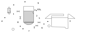 1 – смеситель воды и воздуха; 2 – напорный фильтр; 3 – РЧВ; 4 – подача воды из скважин; 5– отвод фильтрата; 6 – подача промывной воды; 7 - подача воздуха; 8 – отвод промывной воды; 9 – воздушная трубка