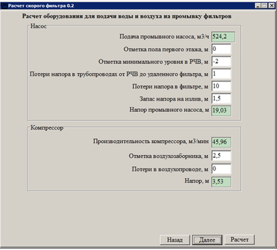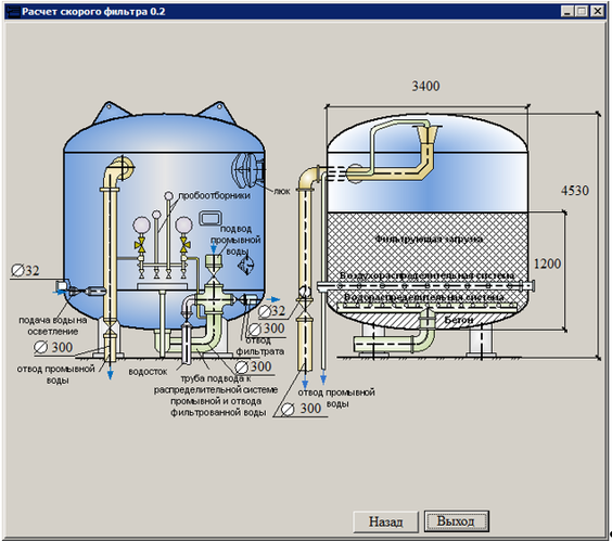 Метод напорного фильтрования с предварительной аэрацией применяется согласно [1] по качеству подземных вод в источнике водоснабжения: содержание железа (общего) – 3,0 мг/л, что менее 10 мг/л; содержание двухвалентного железа – 4,0 мг/л, рН воды – 7,0, что более 6,8; сероводород – 1 мг/л, что не превышает 2 мг/л.