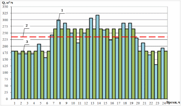 1- график водопотребления; 2- график подачи воды от НС - 1; 3 – график подачи воды от НС – 2