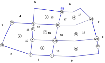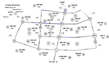 Совокупность магистралей и перемычек представляет собой кольцевую сеть, состоящую из семи колец, 13узлов и 19 участков.