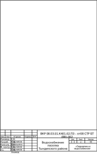 В выпускной квалификационной работе рассмотрена система водоснабжения поселка возле города Тында (Амурская область) с численностью населения 12000 человек и производительностью 5640 м3/сут.