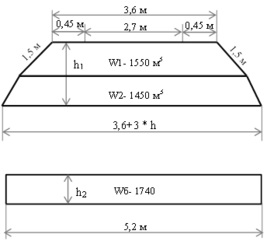 Рис. 4.7 Объем выгружаемого балласта: W1 – объем выгружаемого балласта; W2 –оставшийся балласт после очистки; h1 – высота балластной призмы (0,65 м); h2 – глубина очистки (35 см);
