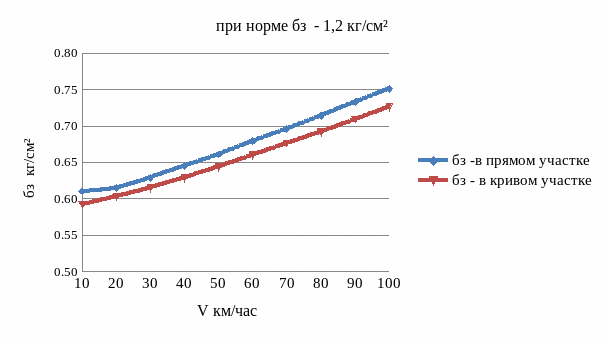 По графику видно, что напряжения в прямом и кривом участке пути также изменяются по линейному закону и не превышают допускаемого значения 1,2 кг/см