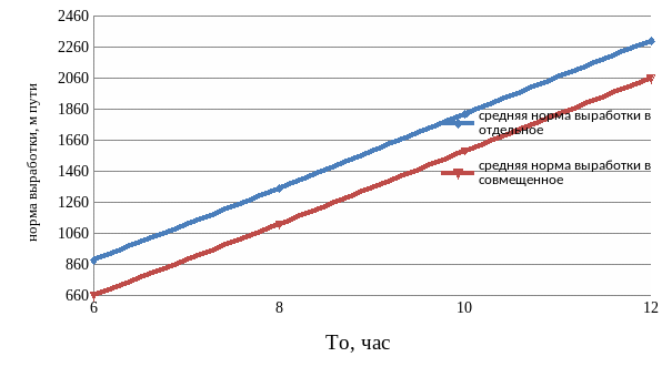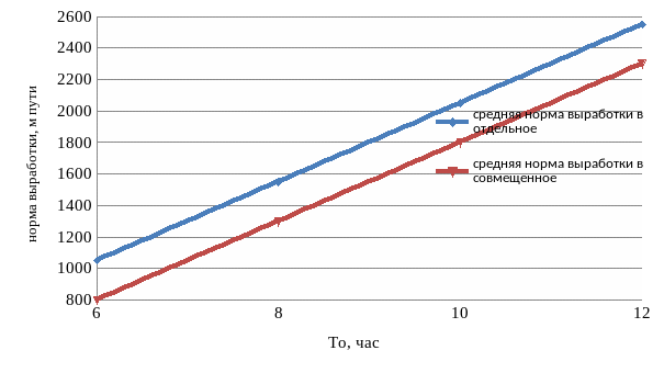 Из графика следует, что фронт выполненных работ в отдельное «окно» продолжительностью 12 часов составит 2300 метров пути, фронт выполненных работ в совмещенное «окно» продолжительностью 12 часов составит 2060 метров пути.