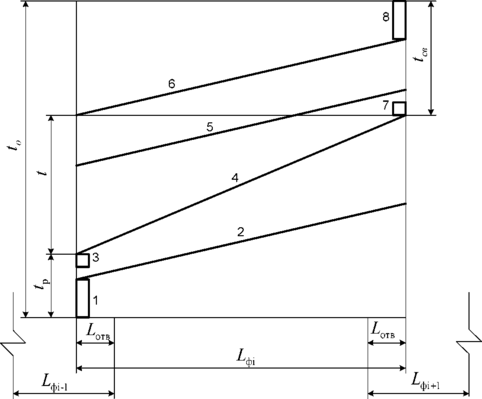 Рис.4.4 Интервалы времени, составляющие технологическое окно: 1-оформление закрытия перегона, пробег машин к месту работ, приведение машин в рабочее состояние; 2,5,6-выполнение операций, предшествующих ведущей и последующих за ней; 4-выполнение лимитирующей (ведущей); 3,7-зарядка и разрядка ведущей машины; 8- приведение машин в транспортное состояние, проверка состояния пути и устранение отступлений, пробег машин от места работ на станцию.Lотв - длина отвода, км; Lфi- фронт работы, км (Lфi-1,Lфi+1предыдущий и последующий соответственно).
