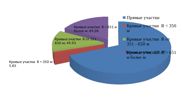 Протяжение прямых участков в плане составляет 275,368 км или 68,8% от главного хода. Протяженность кривых участков пути составляет 124,845 км или 31,2% развернутой длины главных путей, в том числе кривых R 350 м и менее – 5,647 км, R от 351 м до 650м –49,934 км, R 651 м и более – 69,264 км. Протяженность прямых и кривых участков пути представлена на рис. 1.1