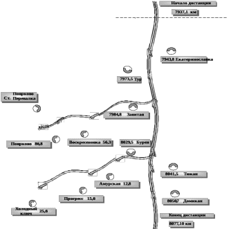 В границах дистанции пути расположено 12 раздельных пунктов, в том числе (Екатеринославка, Тур, Завитая, Тюкан, Бурея, Домикан, Воскресеновка, Поярково, Переваловка Амурская, Прогресс, Холодный Ключ).