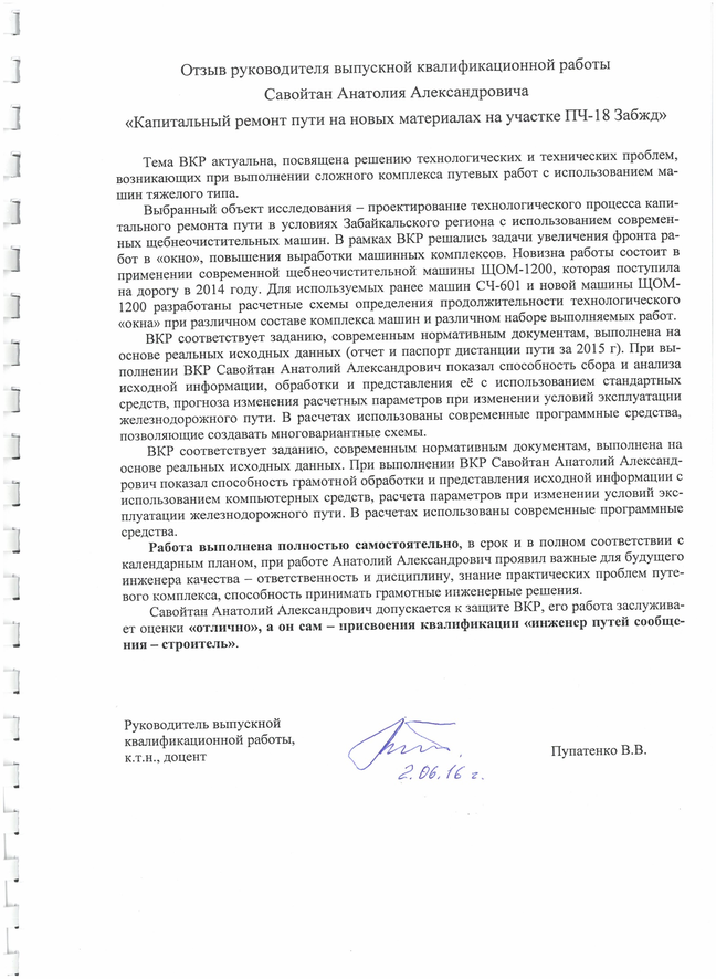 В данном дипломном проекте рассматривается капитальный ремонт пути на новых материалах на участке четного пути перегона Екатеринославка – Тур 7956 пикет 1 – 7962 пикет 8 Завитинской дистанции пути Забайкальской дирекции инфраструктуры.
