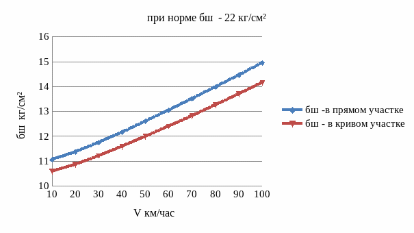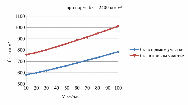 По графику видно, что напряжения в прямом и кривом участке пути также изменяются по линейному закону и не превышают допускаемого значения 1,2 кг/см