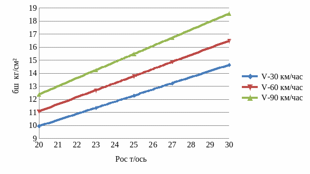 Из графика следует, что при скорости движения 90 км/час и Рос=20 т/ось,