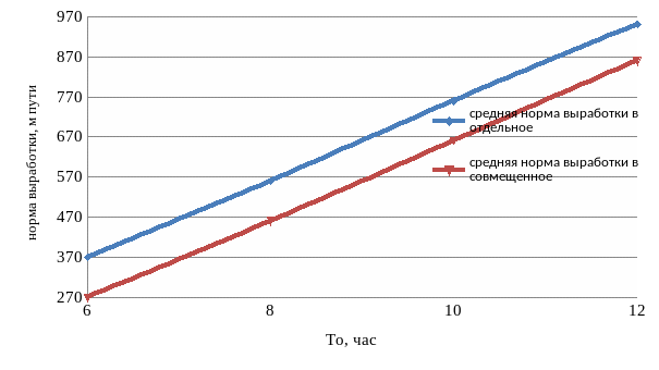 Из графика видно, что фронт выполненных работ в отдельное «окно» продолжительностью 12 часов составит 2550 метров пути, фронт выполненных работ в совмещенное «окно» продолжительностью 12 часов составит 2300 метров пути.