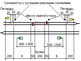 Место производства работ на перегоне ограждается порядком указанным на рисунке 7.2. Устанавливаемые на расстоянии 50 м от границ участка, требующего ограждения, переносные красные сигналы должны находиться под охраной стоящих около них сигналистов с ручными красными сигналами.