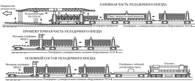 При относительно большом объеме укладки он расцепляется на головную, промежуточную и основную части. Головная часть состоит из укладочного крана УК-25/9-18 и сцепленных с ним платформ: одной платформы прикрытия и нескольких платформ, оборудованных универсальным съемным оборудованием УСО-4. Параметры головной части позволяют крану быстро разгоняться и точно останавливаться у конца звена на расстоянии не менее 1 м. С целью безопасности на указанном расстоянии устанавливается тормозной башмак. Кран и платформа прикрытия постоянно соединены между собой автосцепками с запорными устройствами. В варианте исполнения укладочного крана он постоянно сцеплен с тяговой моторной платформой (УК-25/9-18МП). Это позволяет увеличить массу головной части. Пакеты звеньев с перевернутым нижним звеном перетягиваются вдоль платформ по роликовым транспортерам с помощью лебедки, установленной на кране. Кран укладывает звенья в путь, циклически передвигаясь на вновь уложенное звено. Нижнее звено пакета перед окончательной укладкой выносится перед краном и переворачивается.