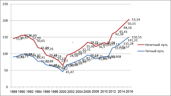 В 2016 году общее количество деревянных переводных брусьев в главных путях не изменилось 1,355. Процент негодности переводных брусьев, по сравнению с 2015 годом увеличился с 16%, до 20%.