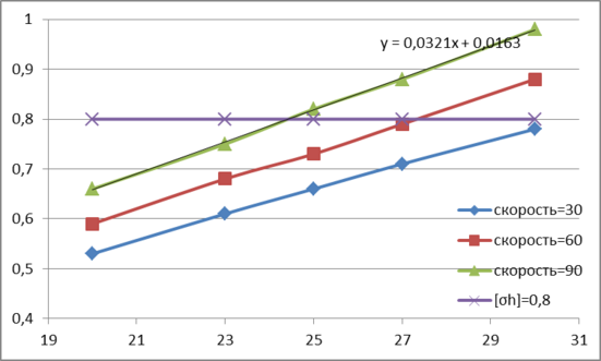 На графике построены три зависимости для скоростей 30,60,90 км/час. И подобранно уравнение напряжений на шкалах от осевой нагрузки: