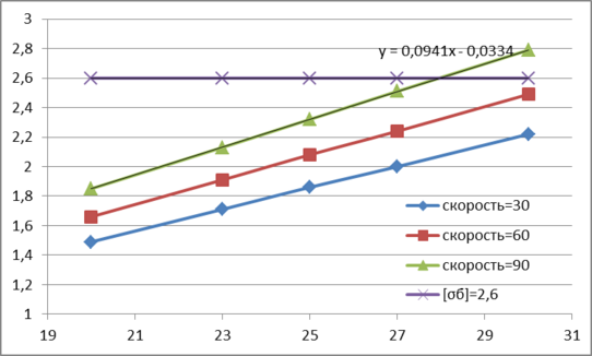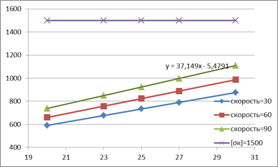 На графике построены три зависимости для скоростей 30,60,90 км/час. Подобранно уравнение напряжений от осевой нагрузки на основной площадке земляного полотна: