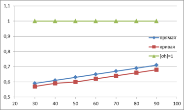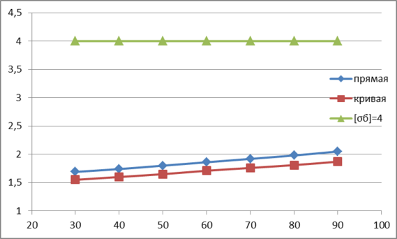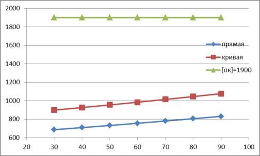 Допускаемое напряжение значительно выше расчетных в диапазоне скоростей до 90 км/час как в кривой так и в прямом участке.