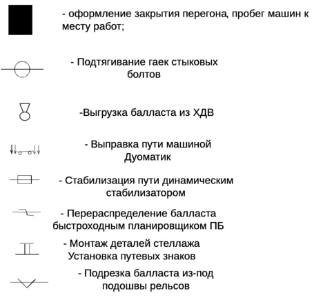 После того как рельсошпальная решетка полностью засыпана щебнем производится постановка пути на щебень электробалластером (3 машиниста). Как только ЭЛБ отходит на безопасное расстояние, ВПО начинает производить выправку и рихтовку пути (3 машинистов). Через некоторое время после начала работы ВПО 3 м.п. бригады № 1 начинают установку заземлений опор контактной сети. За ВПО, при освобождении места работ, ХДВ № 2 выгружает щебень по концам шпал, за ней следует ДСП (2 машиниста) и ПБ (3 машиниста). После ПБ 4 монтера пути бригады №1 устанавливают рельсовые соединители.