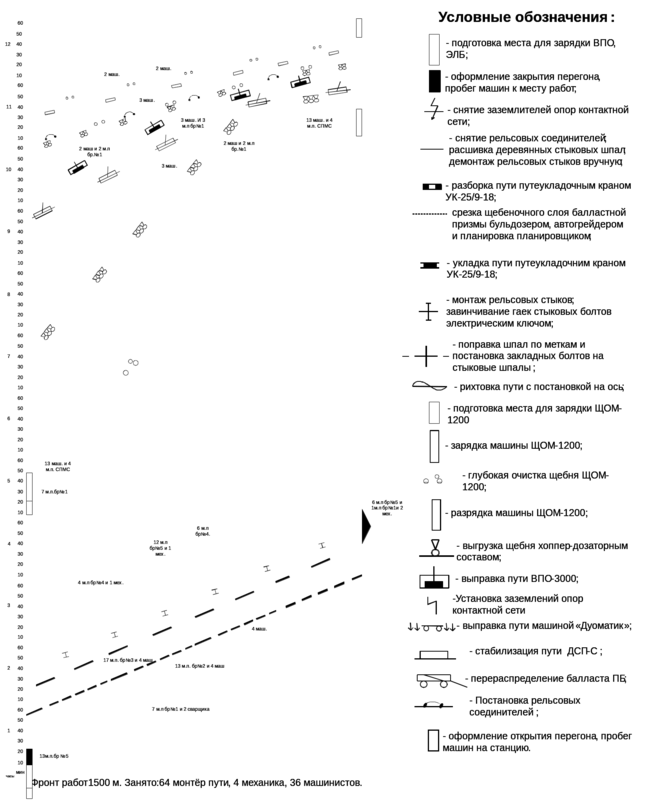 Работы по замене рельсошпальной решетки производятся в “окно” 12 часов. Фронт работ 1500 п.м. Рабочие поезда выходят в следующем порядке: