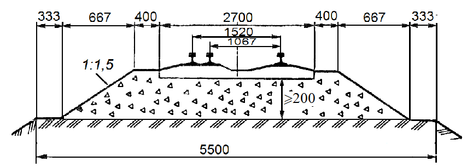 - шпалы – новые железобетонные под совмещенную колею 1520 мм/1067 мм количеством 1600 шт/км в прямых, в кривых участках пути с радиусом менее 1200 м – 1840 мм;