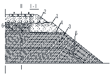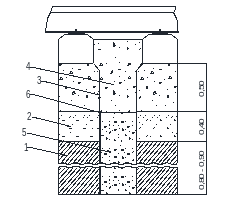 Рис. 6.13. – Поперечный разрез дренажной прорези: 1 – пучинистый грунт; 2 – загрязнённый песчано-гравийный балласт; 3 – стенка прорези; 4 – щебень с размерами фракции 25–60 мм; 5 – щебень с размерами фракции 5–25 мм; 6 – геотекстиль.