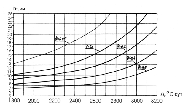 Где - hт – нормативная толщина слоя пенопласта, см, определяемая по графикам (рис. 2.1) в зависимости от 10 – максимальной в десятилетнем периоде суммы градусосуток отрицательных температур и толщины слоя балласта под пенопластом; т – коэффициент теплопроводности пенопласта (0,04 ккал/мчС); н – коэффициент надежности, принимаемый равным 1,2; Wоб – нормативное водопоглощение по объему, принимается равным 0,5 % (0,005).