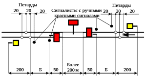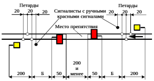 Препятствия на перегоне ограждаются с обеих сторон на расстоянии 50 м от границ ограждаемого участка переносными красными сигналами. От этих сигналов на расстоянии Б, в зависимости от руководящего спуска и максимальной допускаемой скорости движения поездов на перегоне укладывается по три петарды и на расстоянии 200 м от первой, ближней к месту работ петарды, в направлении от места работ устанавливаются переносные сигналы уменьшения скорости [25].