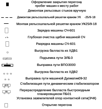 Перед производством основных работ по замене рельсошпальной решетки на фронте работ, соответствующему длине участка основных работ в “окно”, демонтируются стеллажи покилометрового запаса рельс, снимаются путевые и пикетные знаки, подготавливаются места съездов и заездов на путь землеройной техники, разбирается переездный настил, если таковой имеется, опробываются и смазываются стыковые болты, производится вырезка балласта из шпальных ящиков (в местах зарядки бульдозера).
