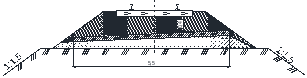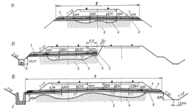 Высокие насыпи возводились длительное время, и за период строительства их неуплотнённый грунт неоднократно подвергался глубокому замачиванию дождевыми осадками. Возведённые на проектную высоту насыпи в первые же годы подвергались неравномерному доуплотнению их грунта. Основная площадка, оформленная по проекту в виде трапеции (рис.1.1) на период укладки верхнего строения пути, через некоторое время после начала движения поездов приобретала искаженную форму с просадками разного очертания.