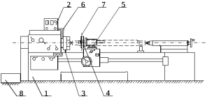 Рисунок 3.3 – Электроимпульсная установка: 1- токарно – винторезный станок 1М63; 2- генератор; 3- токосъемник; 4- инструмент многоэлектродный; 5- плита монтажа инструмента многоэлектродного на суппорте станка 1М63; 6- кабель инструмента многоэлектродного; 7- электрод (20 штук); 8-мотор-редуктор