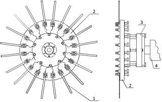 Рисунок 3.4 – Многоэлектродный инструмент: 1- электрод (20 штук, размер 6x1x100 мм); 2- диск многоэлектродного инструмента; 3- головка крепления диска; 4- электродвигатель диска