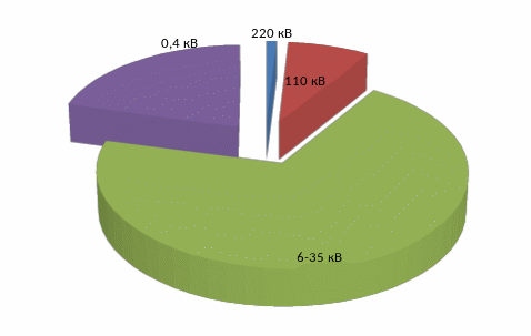 Электрические сети напряжением 6÷35 кВ в РФ относятся к распределительным сетям. В общем количестве электрических сетей значительную долю по протяженности и количеству трансформаторных подстанций занимают сети 6-35 кВ, которые составляют 70 % от общего объема распределительных сетей РФ, как показано на рисунке 1.1[3].