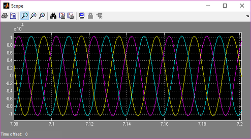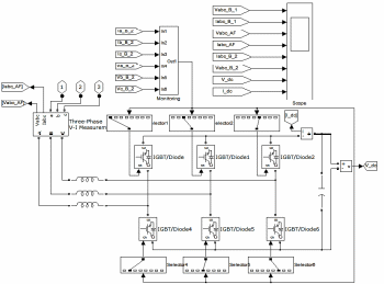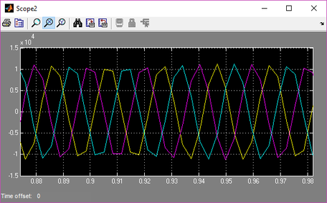 Для моделирования в среде MATLAB блоков системы управления, описанных выше, используем блок «Мonitoring», в котором происходит генерация идеальной синусоиды, которая совпадает по фазе и среднеквадратичному значению напряжения нагрузки. При обнаружении ошибки виртуальными измерителями между идеальной и подлинной синусоидой, происходит коммутация силовых ключей по заданному алгоритму, и устройство динамической фильтрации генерирует сигнал ошибки в сеть с небольшой задержкой во времени, тем самым, приводя форму напряжения на нагрузке ближе к идеальной синусоиде, в результате обеспечивается требуемое качество электрической энергии. Смоделированное устройство динамической фильтрации (Three-Phase Dynamic filtering device) показано на рисунке 4.6.
