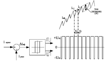 Для коммутации транзисторами воспользуемся методом «слежения» или гистерезисной модуляции, называемым также – дельта-модуляцией. Принцип работы этого метода заключается в мониторинге за реальным током нагрузки и сравнении его с идеальным током, заданным законом модуляции. Описание данного принципа модуляции представлено в источниках [51, 53-55]. Физически такой коммутатор состоит из пропорционально-интегрального звена (ПИ-регулятора), на который поступает разность идеального и фактического тока, а далее сигнал передается на релейно-импульсный компаратор, где регулирование отклонений токов и напряжений задается шириной гистерезисной петли (рисунок 4.5).