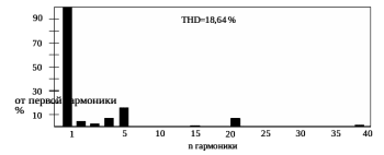 Из спектрального анализа ВГС наблюдаем, что наибольшее влияние оказывают 2, 4, 5, 21 гармоники, а общий гармонический коэффициент равен 18,64 %, что значительно превышает допустимые 5% [2].