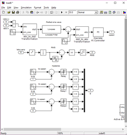 Система управления «Мonitoring» включает в себя три основных блока: Perfect sine wave, RMS, Hysterisis. Блок «Perfect sine wave» служит для генерации сигнала идеальной синусоиды с подобной нагрузке частотой и сдвигом фаз. Блок «RMS» необходим для вычисления среднеквадратического значения тока нагрузки. Вычисляемая разность между фактическими компенсирующими токами нагрузки и идеальными токами передается на релейный блок «Hysterisis», настраиваемый таким образом, чтобы выходные значения управляющего сигнала составляли значения +1 и -1, при этом ширина зоны гистерезиса по выходному сигналу была достаточно узкой, чтобы точно генерировать эталонный сигнал управления транзисторным инвертором. Промежуточные блоки системы управления УДФ «Мonitoring» представлены на рисунке 4.7.