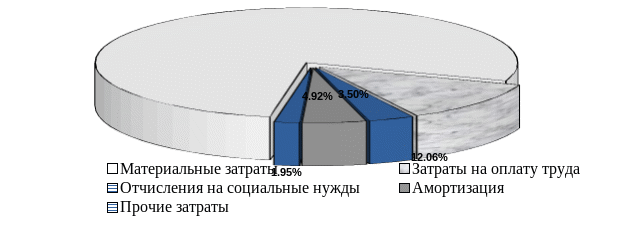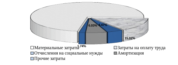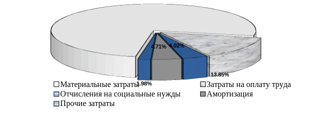 Наибольший удельный вес в структуре затрат предприятия приходится на материальные затраты и затраты на оплату труда, наименьший – на амортизацию и прочие затраты.