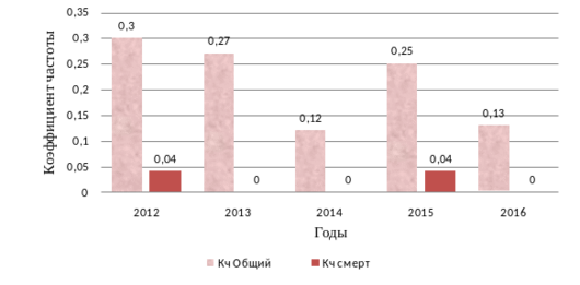 Рисунок 2.2 Коэффициент частоты производственного травматизма в Центральной станции связи за период 2012-2016 гг.